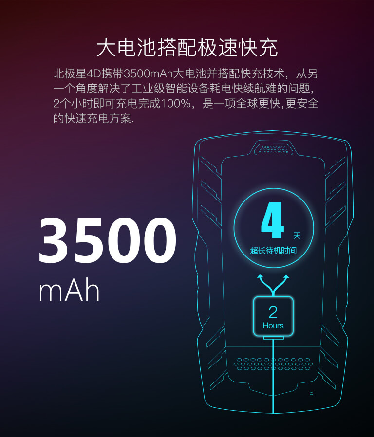 北極星4D攜帶3400mAh大電池并搭配快充技術(shù),從另一個角度解決了工業(yè)級智能設(shè)備耗電快續(xù)航難的問題,2個小時即可充電完成100%,是一項全球更快,更安全的快速充電方案.