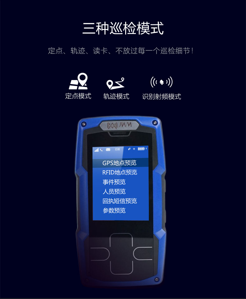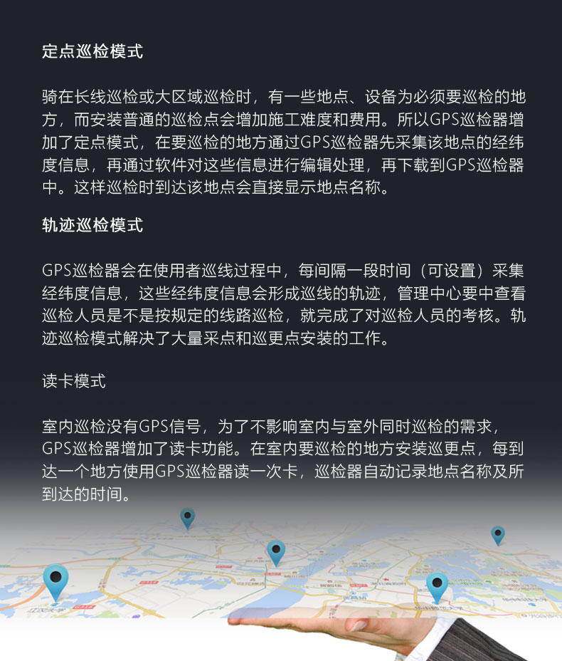 在在長線巡檢或大區域巡檢時,有一些地點、設備為必須要巡檢的地方,而安裝普通的巡檢點會增加施工難度和費用。所以GPS巡檢器增加了定點模式,在要巡檢的地方通過GPS巡檢器先采集該地點的經緯度信息,再通過軟件對這些信息進行編輯處理,再下載到GPS巡檢器中。這樣巡檢時到達該地點會直接顯示地點名稱。