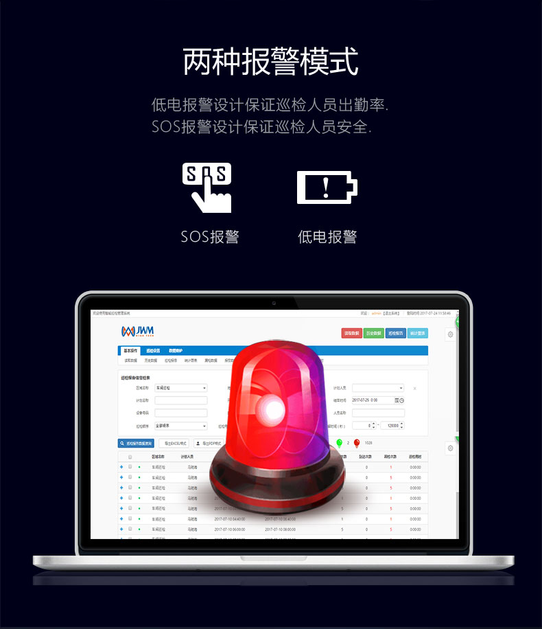 巡檢人員在巡檢過程中可能碰到安全事故或人身安全威脅,SOS報警的設計是為了保障巡檢人員的安全,當碰到危險情況時巡檢人員可一鍵觸發SOS報警按鍵。管理者可接到報警電話,管理中心可以收到報警數據。同時管理中心會向管理推送APP報警信息。