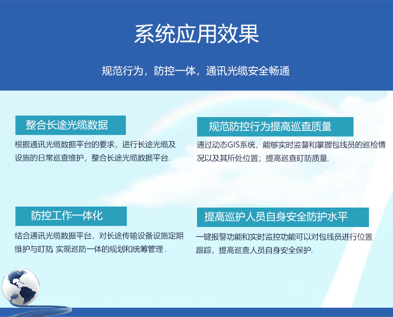 通過《通訊光纜GPS巡檢管理系統》,規范巡檢行為,強化巡查質量,實現通訊光纜防控工作科學化、規范化、智慧化和平臺化的推進和實施,確保通訊網絡安全暢通